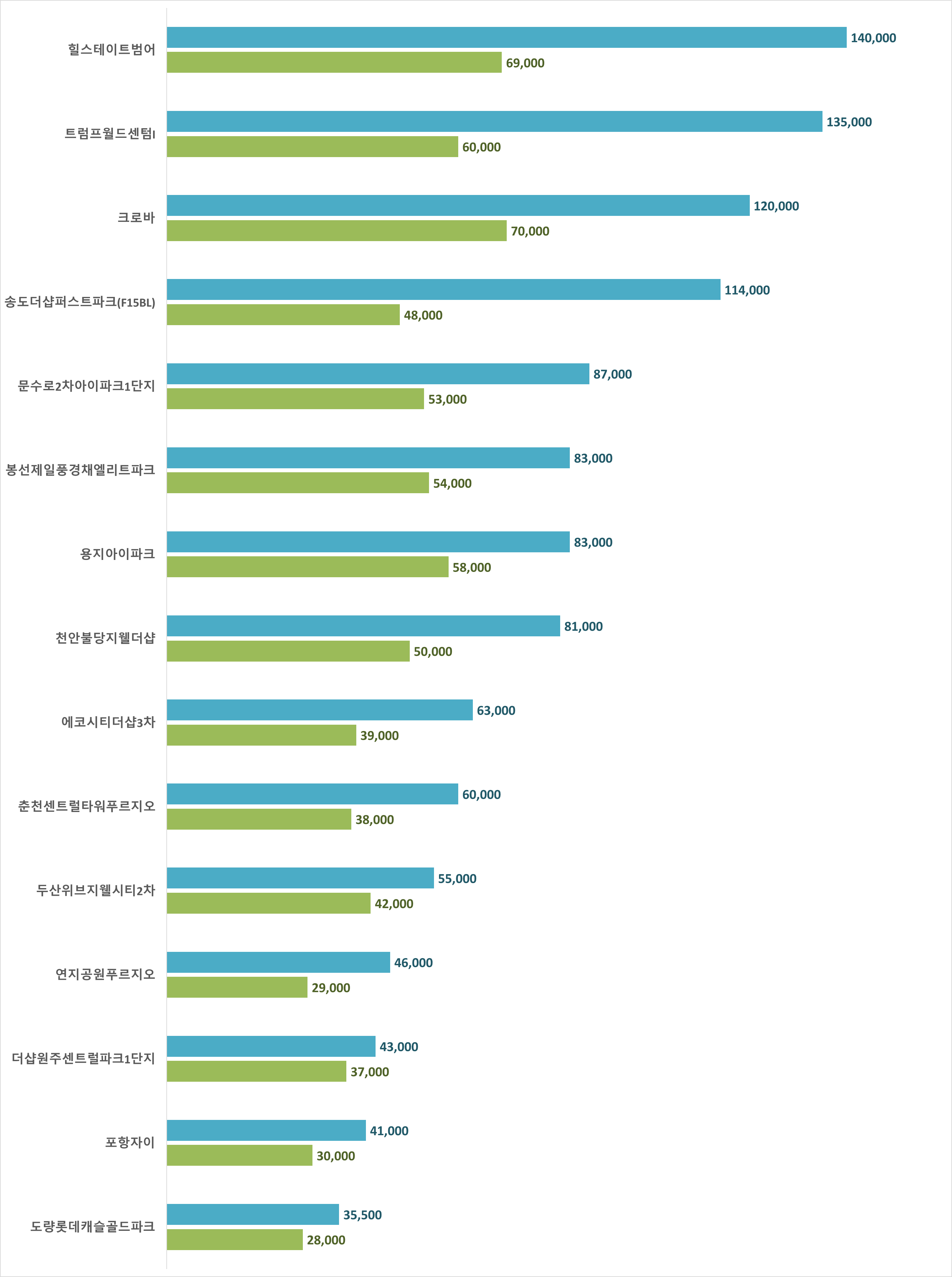 매매 시세는 대구 수성구 힐스테이트범어가 지난 주와 동일하게 14억 원으로 가장 높게 나타 났습니다. 그 뒤로는 부산 해운대구 트럼프월드센텀I 13.5억 원, 대전 서구 크로바 12억 원, 인천 연수구 송도더샵퍼스트파크(F15BL) 11.4억 원, 울산 남구 문수로2차아이파크1단지 8.7억 원 순으로 나타났습니다.