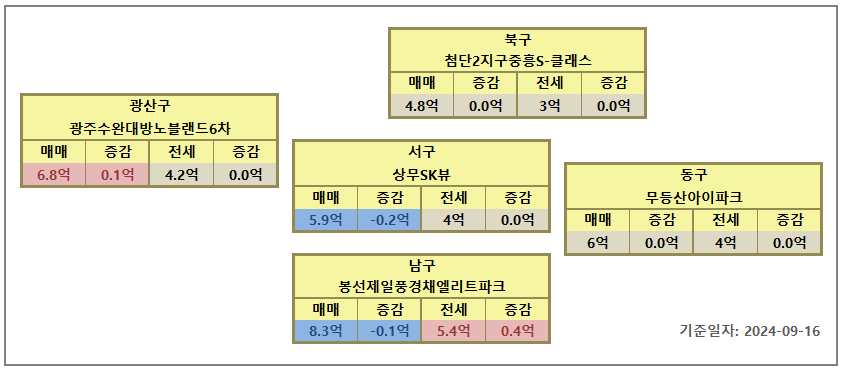 | 남구 | 봉선제일풍경채엘리트파크 | 2024-09-16 | 83,000 | -1,000 | 54,000 | 4,000 | 29,000 | -5,000 | 65.1% | 2,441 | -29 |