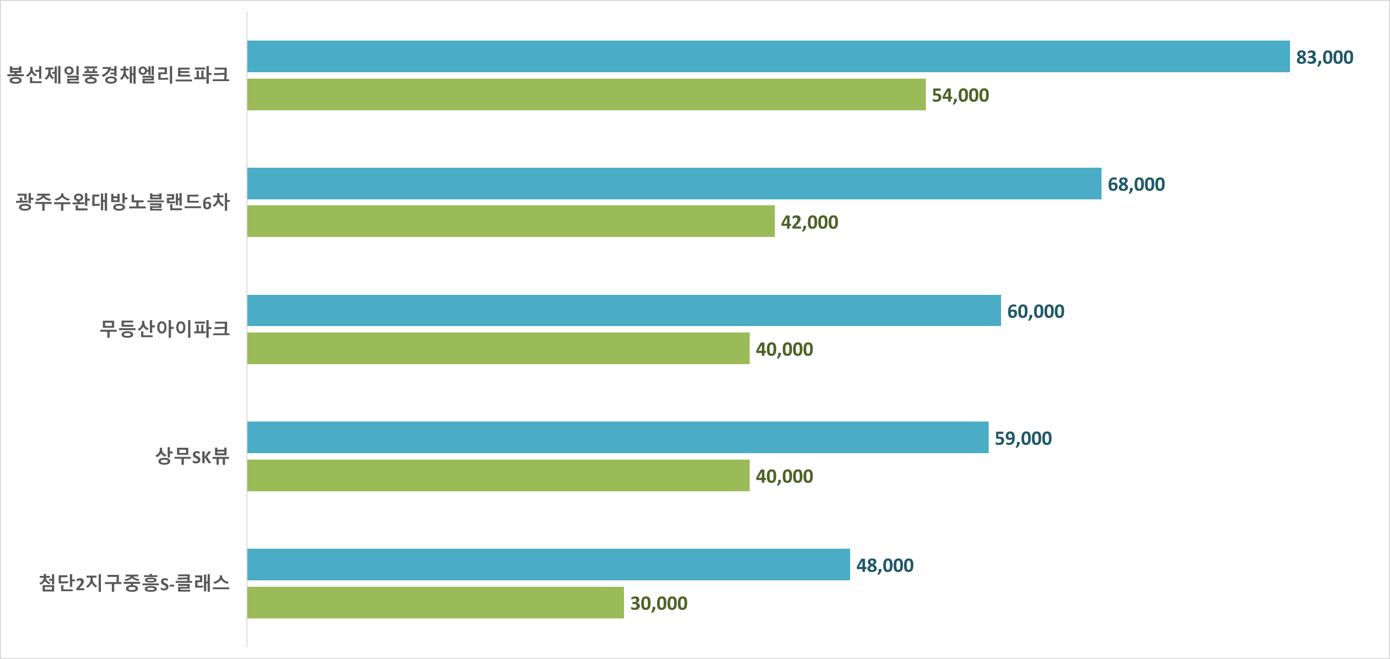 매매 시세는 남구 봉선제일풍경채엘리트파크가 8.3억 원으로 가장 높게 나타 났습니다. 그 뒤로는 광산구 광주수완대방노블랜드6차가 6.8억 원, 동구 무등산아이파크가 6억 원, 서구 상무SK뷰가 5.9억 원, 북구 첨단2지구중흥S-클래스가 4.8억 원 순으로 나타났습니다.