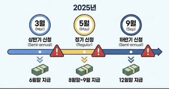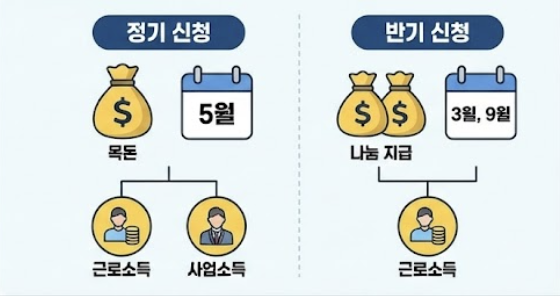 💡 핵심 요약: 근로소득만 있다면 반기(3월/9월)와 정기(5월) 중 선택 가능하며, 사업소득이 있다면 5월 정기 신청만 가능합니다. 정기 신청 기간(5월 1일~31일)을 놓치면 11월 30일까지 기한 후 신청이 가능하지만, 지급액의 10%가 차감됩니다.