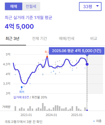 2020년 최고가 6억 1,000만원 대비 약 20% 조정된 상태로, 현재는 안정적인 횡보세를 보이고 있습니다.