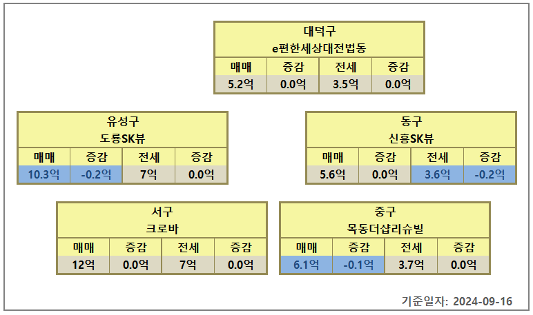 | 유성구 | 도룡SK뷰 | 2024-09-16 | 103,000 | -2,000 | 70,000 | 0 | 33,000 | -2,000 | 68.0% | 3,121 | -61 |