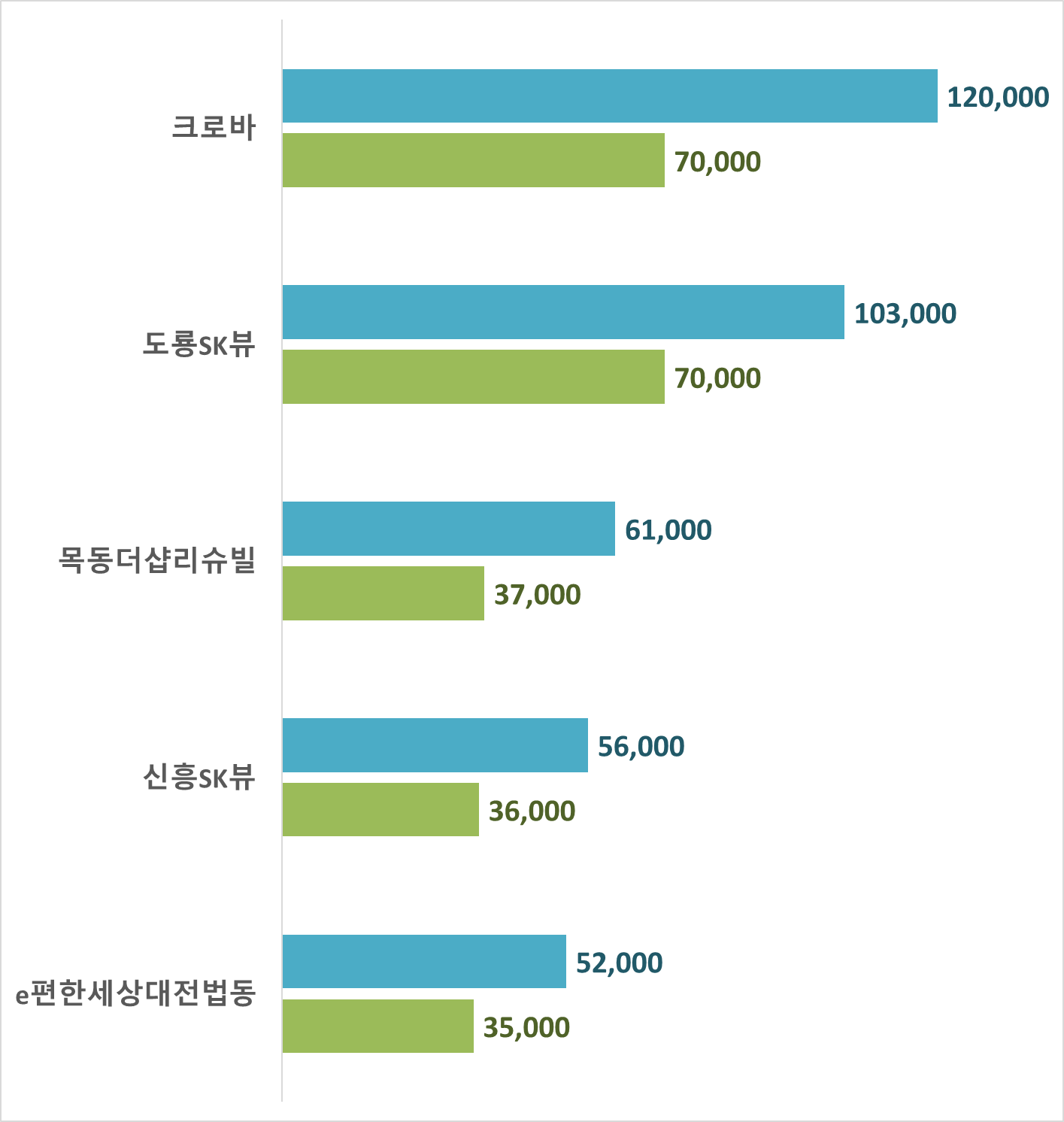 매매 시세는 서구 크로바가 12억 원으로 가장 높게 나타 났습니다. 그 뒤로는 유성구 도룡SK뷰가 10.3억 원, 중구 목동더샵리슈빌이 6.1억 원, 동구 신흥SK뷰가 5.6억 원, 대덕구 e편한세상대전법동이 5.2억 원 순으로 나타났습니다.
