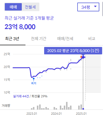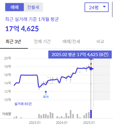 특히 24평(84㎡)은 2024년 12월 최고가(22억 7,500만원) 대비 4,000만원 상승한 23억 1,500만원에 거래되며 신고가를 기록했습니다.
