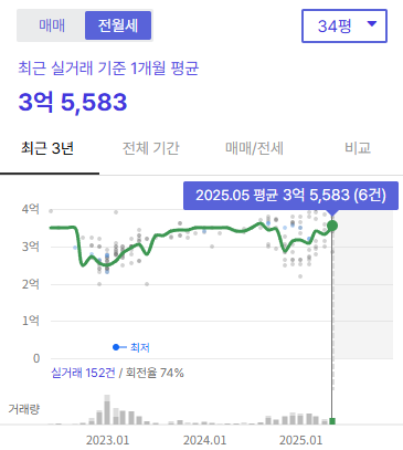 전세 시장도 활발한 움직임을 보이고 있습니다. 84㎡ 기준 3억 4,000만원에서 3억 8,000만원대에 거래되어 전세가율 약 60% 수준을 유지하고 있어, 갭투자 관점에서도 매력적인 조건을 제공합니다.