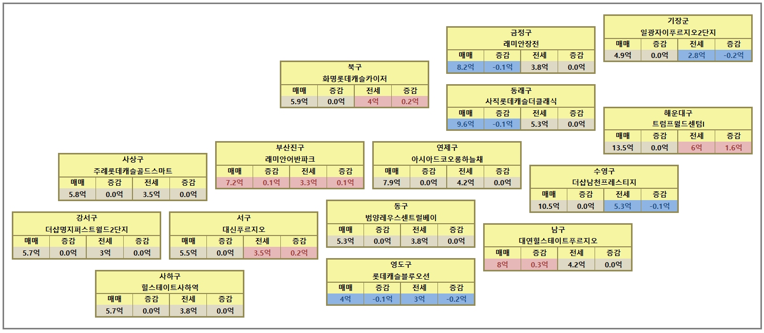 부산광역시 구별 대장 아파트 매매가와 전세가에 대한 시세 자료 공유합니다. 매매 시세는 매매 시세는 해운대구 트럼프월드센텀I, 수영구 더샵남천프레스티지, 동래구 사직롯데캐슬더클래식, 금정구 래미안장전, 남구 대연힐스테이트푸르지오 순으로 나타났습니다.