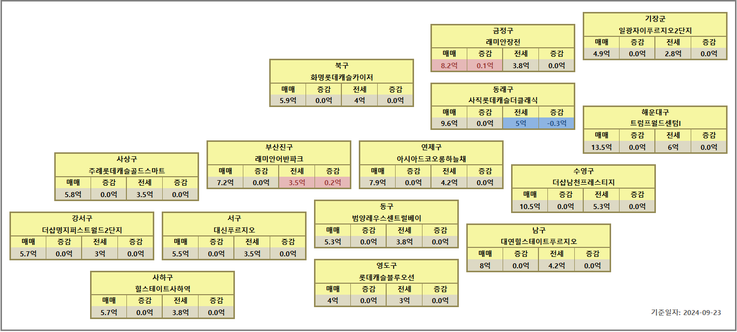 부산 아파트 시세(2024년 9월 4주), 매주 업데이트 되는 구별 대장 아파트 시세