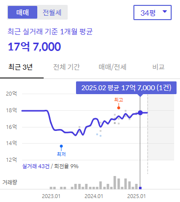 최근 3개월 기준으로는 총 15건의 거래가 있었으며, 모든 평형 중 최고가는 17억 5천만 원이었습니다. 특히 30평대는 1년 전 대비 약 1억 5천만 원 상승했습니다.