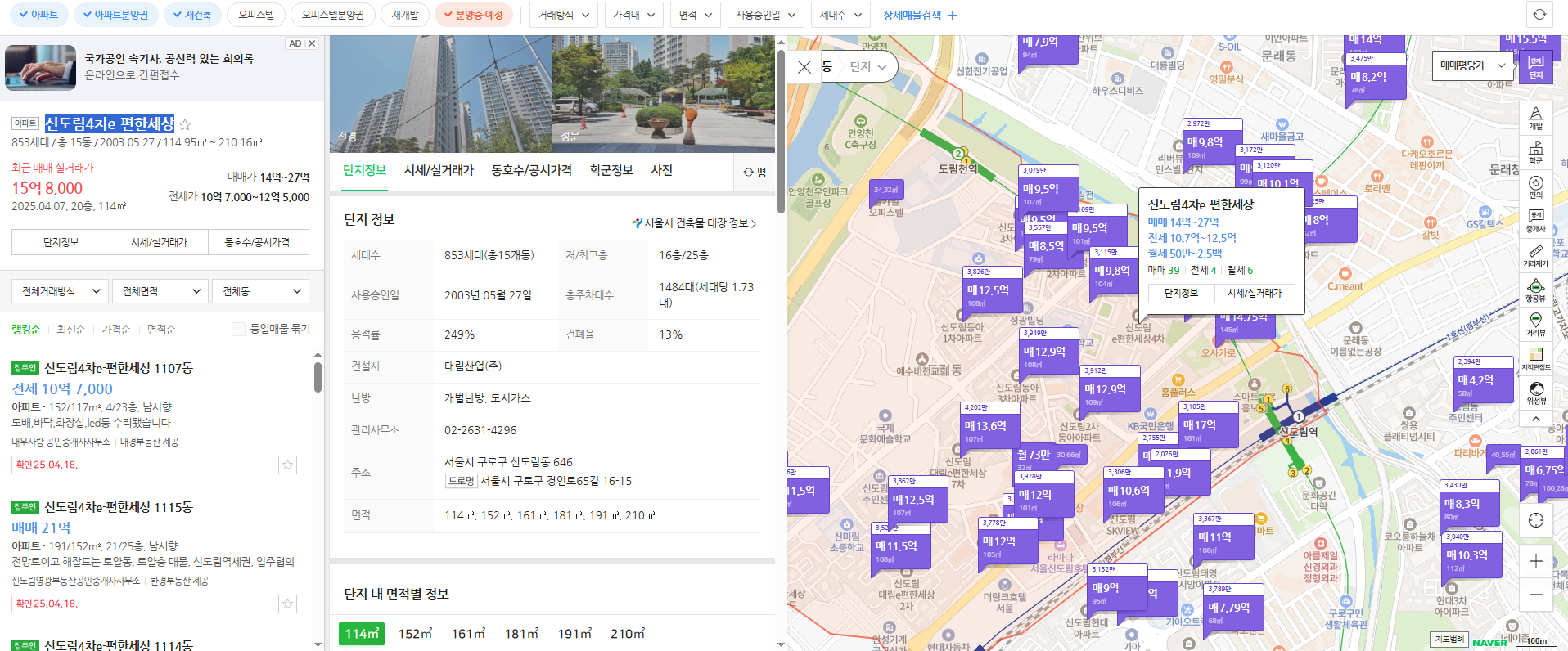 신도림4차e편한세상은 서울 구로구 신도림동 646에 위치한 아파트로, 2003년 5월에 준공된 21년 차 구축 아파트입니다. 총 853세대, 15개동으로 구성되어 있으며, 용적률 249%, 건폐율 13%의 특성을 가지고 있습니다.