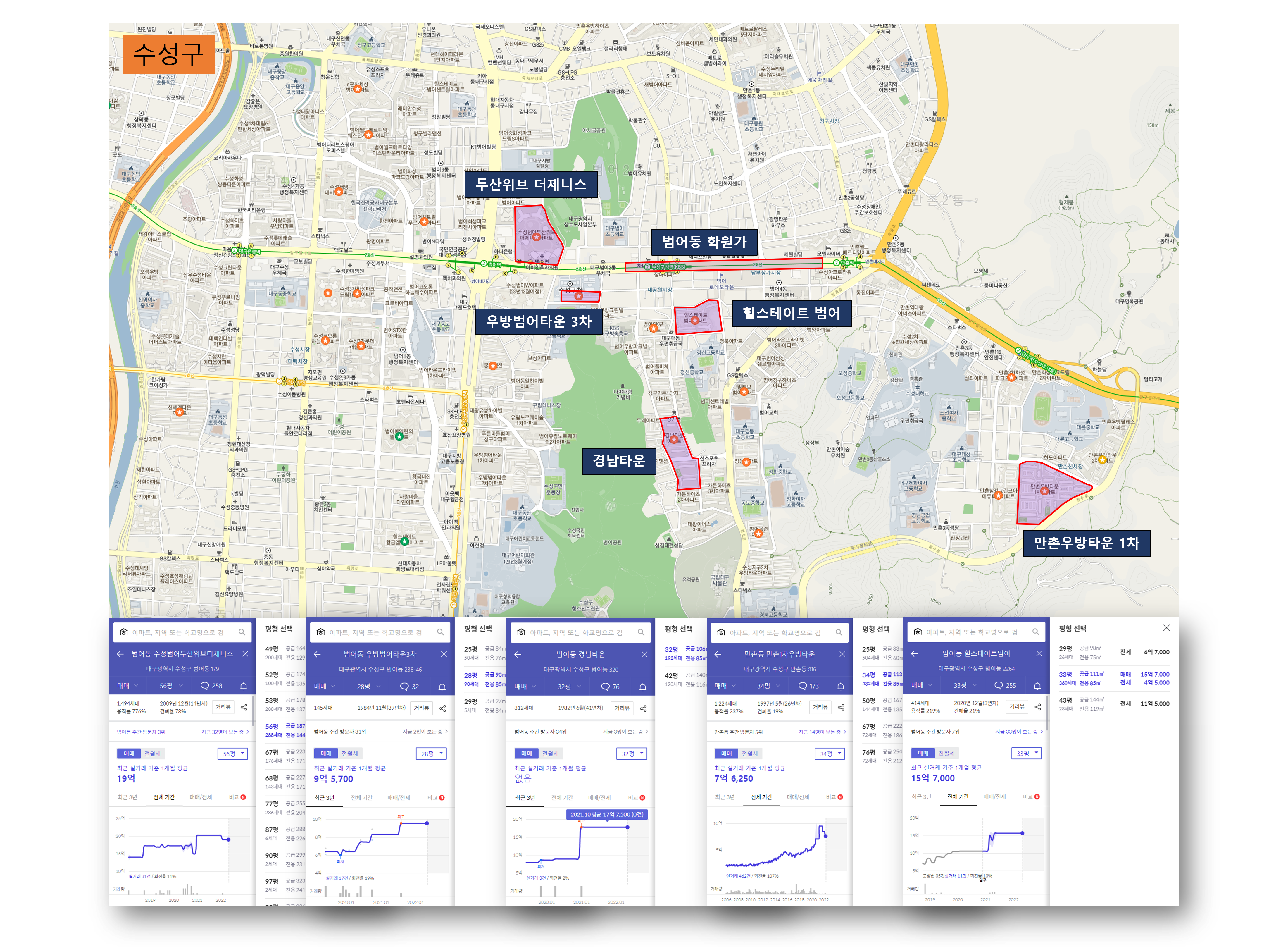 대구광역시 구별 대장아파트 매매가와 전세가에 대한 시세 자료 공유합니다. 매매 시세는 수성구 힐스테이트범어, 중구 남산롯데캐슬센트럴스카이, 북구 오페라삼정그린코아더베스트,