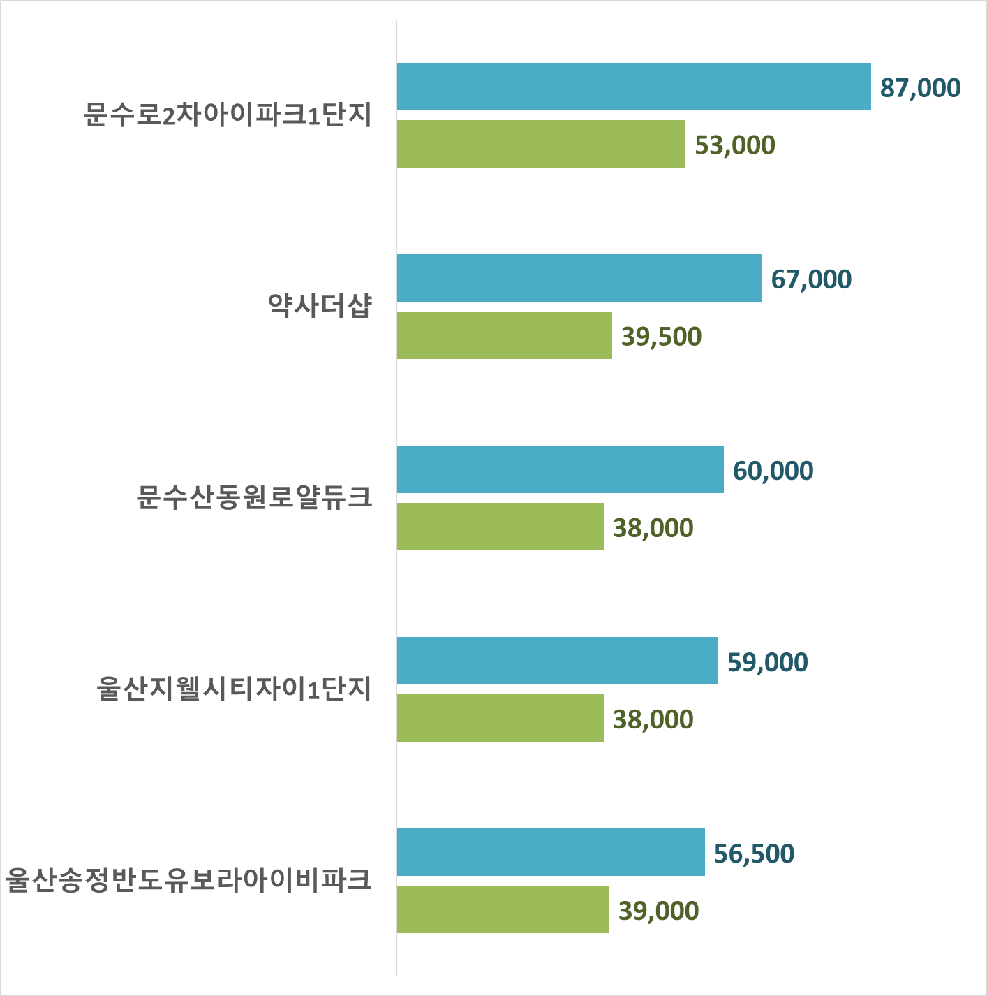 매매 시세는 남구 문수로2차아이파크1단지 8.7억 원으로 가장 높게 나타 났습니다. 그 뒤로는 중구 약사더샵 6.7억 원, 울주군 문수산동원로얄듀크 6억 원, 동구 울산지웰시티자이1단지 5.9억 원, 북구 울산송정반도유보라아이비파크 5.65억 원 순으로 나타났습니다.