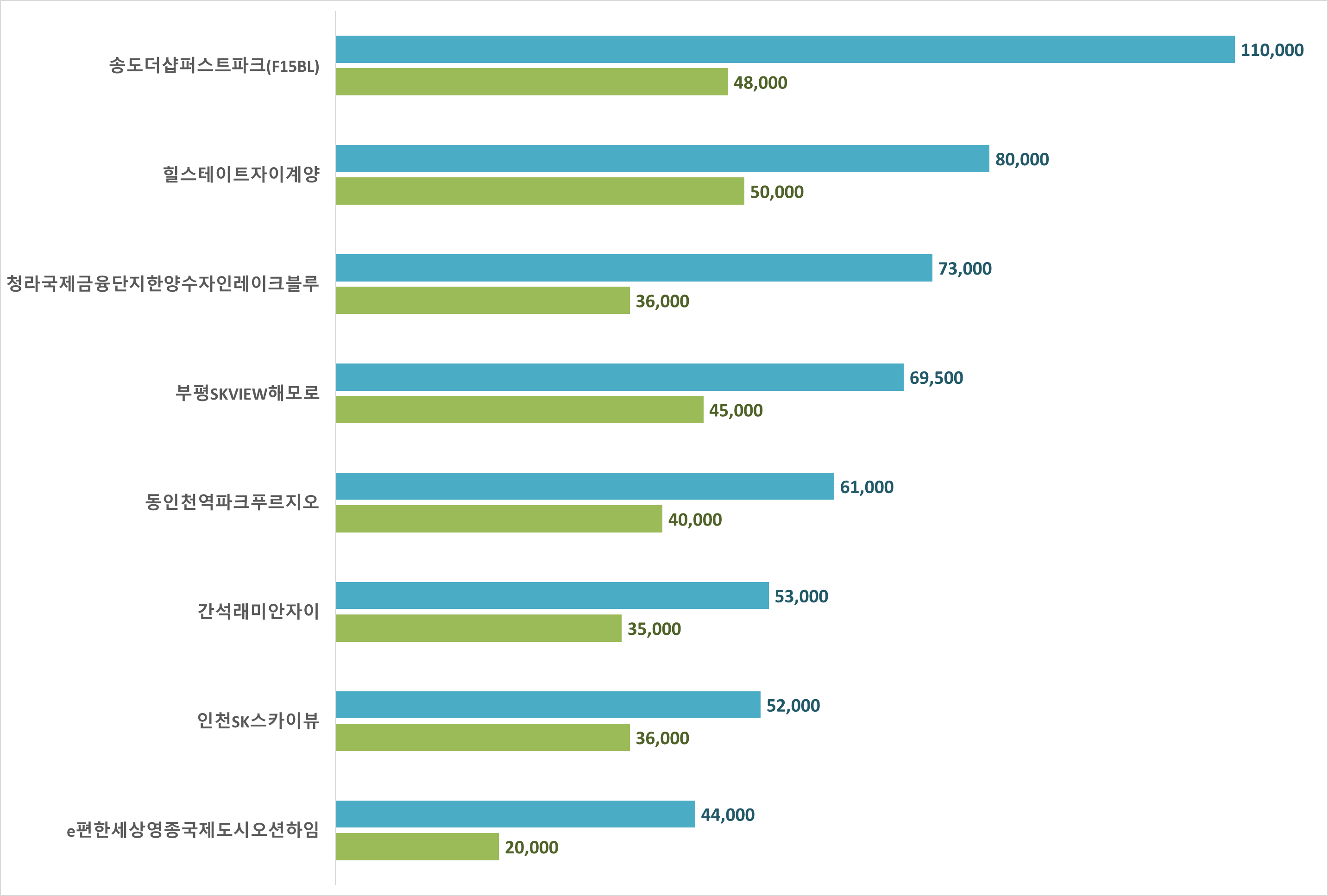 매매 시세는 연수구 송도더샵퍼스트파크(F15BL) 11억 원으로 가장 높게 나타 났습니다. 그 뒤로는 계양구 힐스테이트자이계양 8억 원, 서구 청라국제금융단지한양수자인레이크블루 7.3억 원, 부평구 부평SKVIEW해모로 6.95억 원, 동구 동인천역파크푸르지오 6.1억 원 순으로 나타났습니다.
