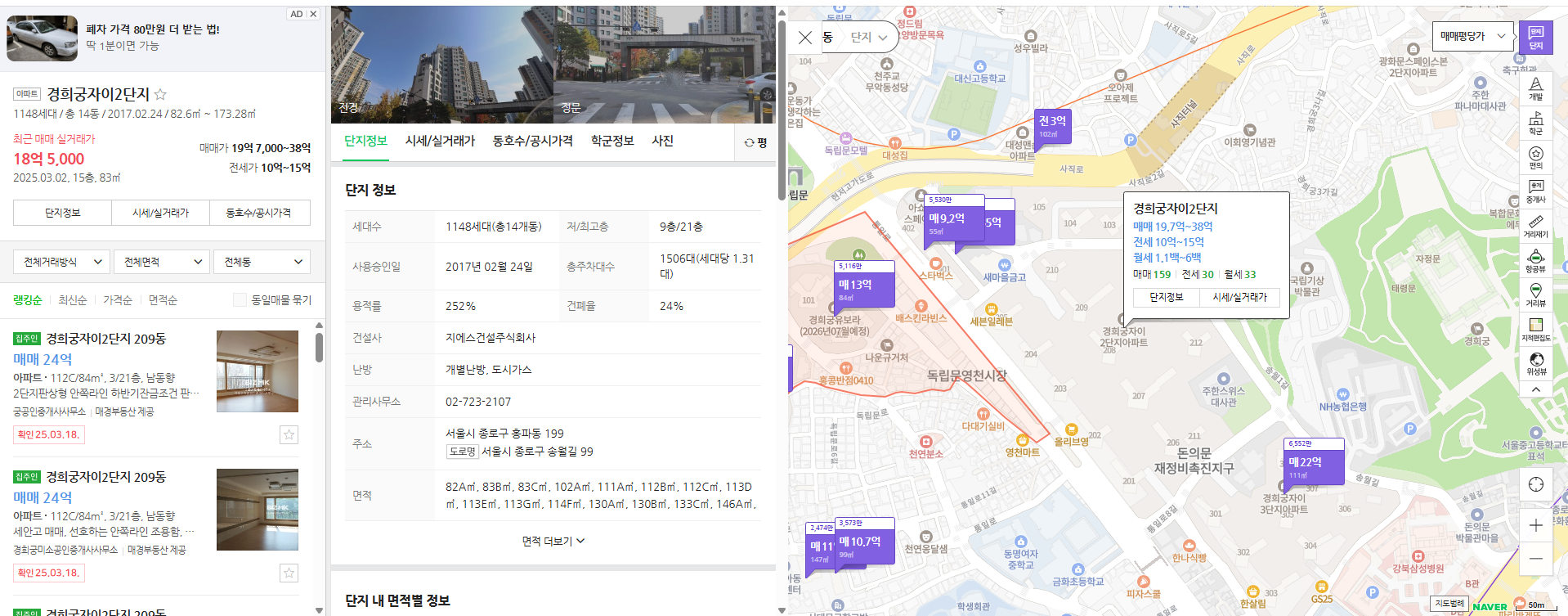 2025년 3월 현재 매물 시세를 보면 84㎡ 기준 24억~26억원대, 101㎡ 기준 26억~27억원대로 형성되어 있으며, 전세가율은 약 41.5%로 원금보존에 유리한 구조를 보이고 있습니다. 또한 서울 부동산 시장에서 종로구는 2025년 공시가격이 약 3% 상승할 것으로 예상되어 안정적인 가치 상승이 기대됩니다.