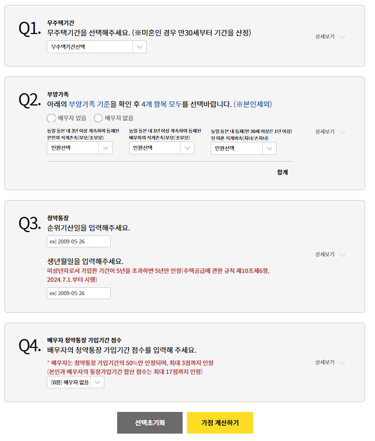부양가족 인정 기준이 워낙 복잡하다 보니, 직접 계산하는 데 어려움을 느끼실 수 있습니다. 가장 확실한 방법은 청약홈의 '청약가점 계산기'를 이용해 최종 확인하는 것입니다.