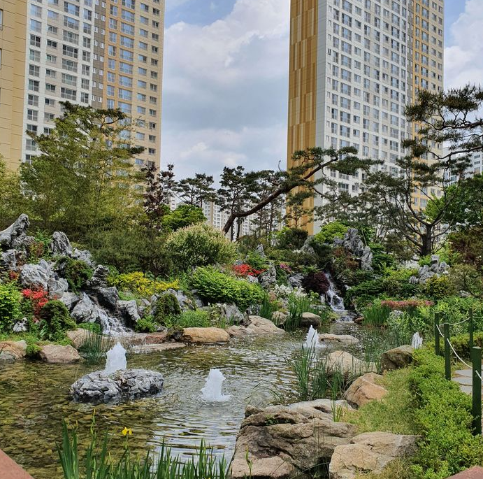 단지 내부는 마치 거대한 공원처럼 꾸며져 있으며, 1.2km에 달하는 순환 산책로, 다양한 테마의 정원, 고급스러운 커뮤니티 시설(수영장, 사우나, 골프연습장 등)은 입주민들의 만족도를 극대화합니다.