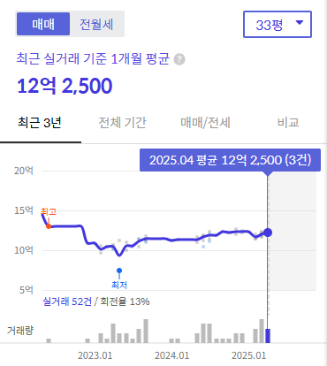 1단지의 경우 2025년 1월 10일 거래된 84.93㎡(34평형)의 실거래가는 12억원이었습니다. 12월 25일에는 같은 평형이 12억 5천만원에 거래되었습니다.